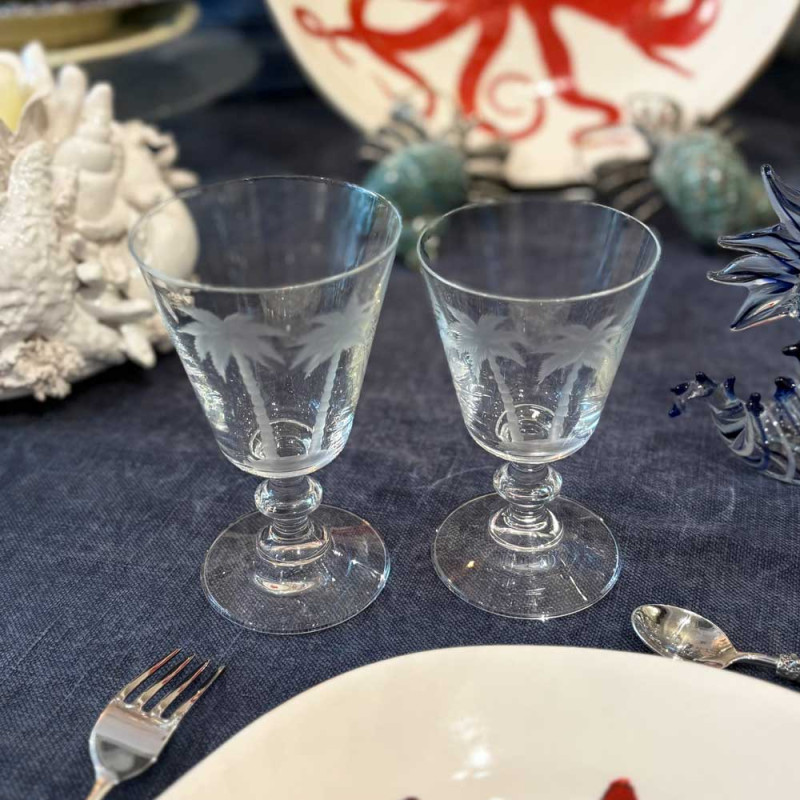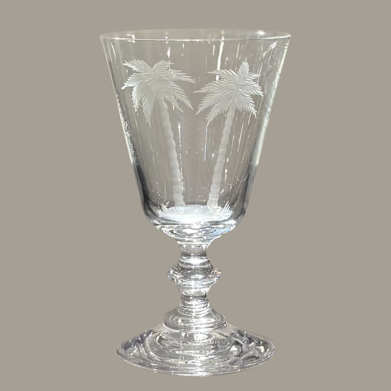 Water glass hand-engraved with palm trees.