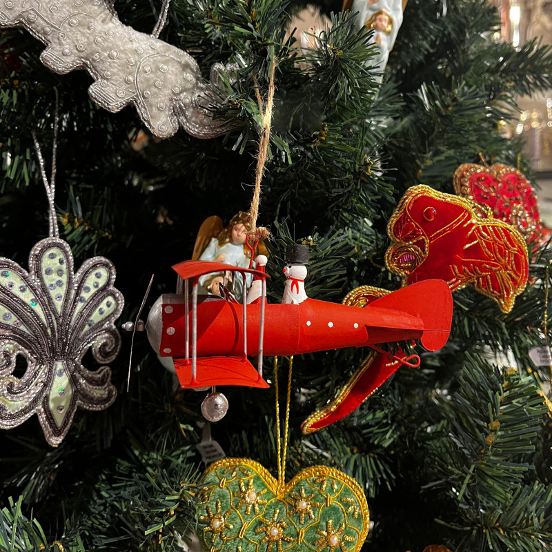 Hanging decoration featuring Santa Claus and a snowman made of metal in their red plane.