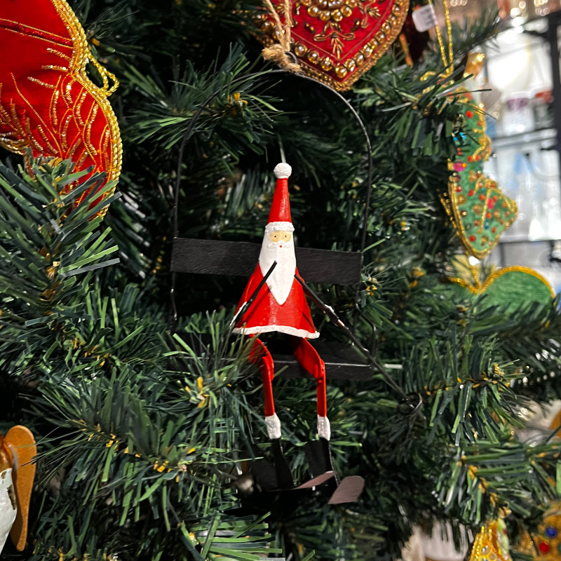 Hanging decoration Santa Claus in skis on a chairlift made of metal.