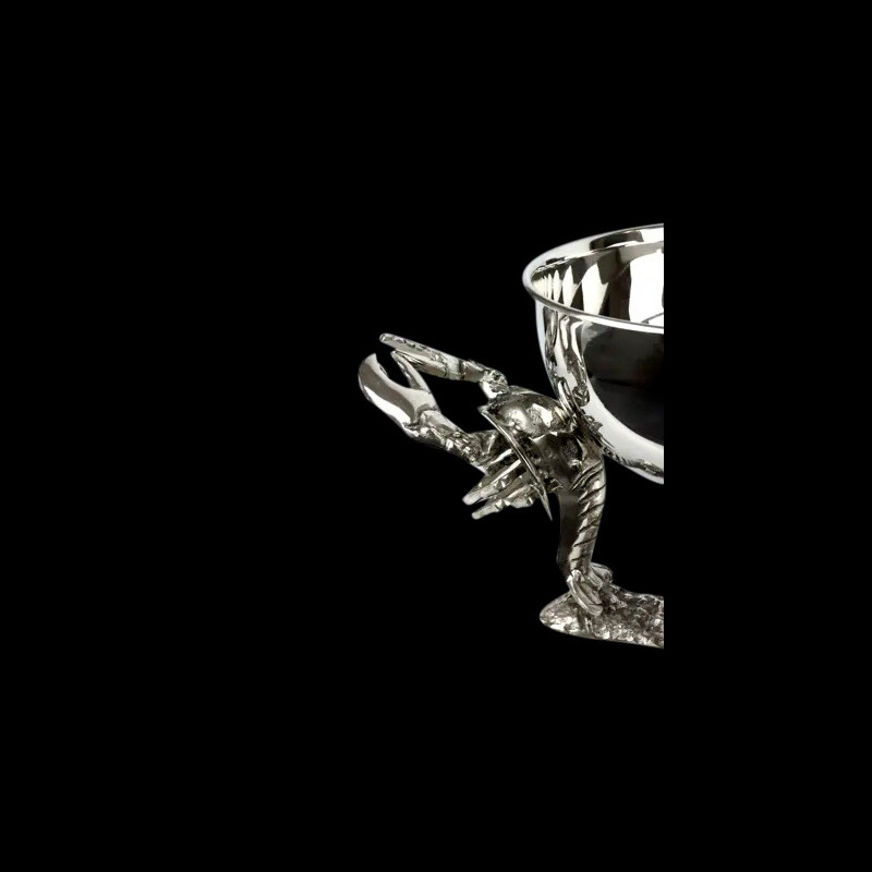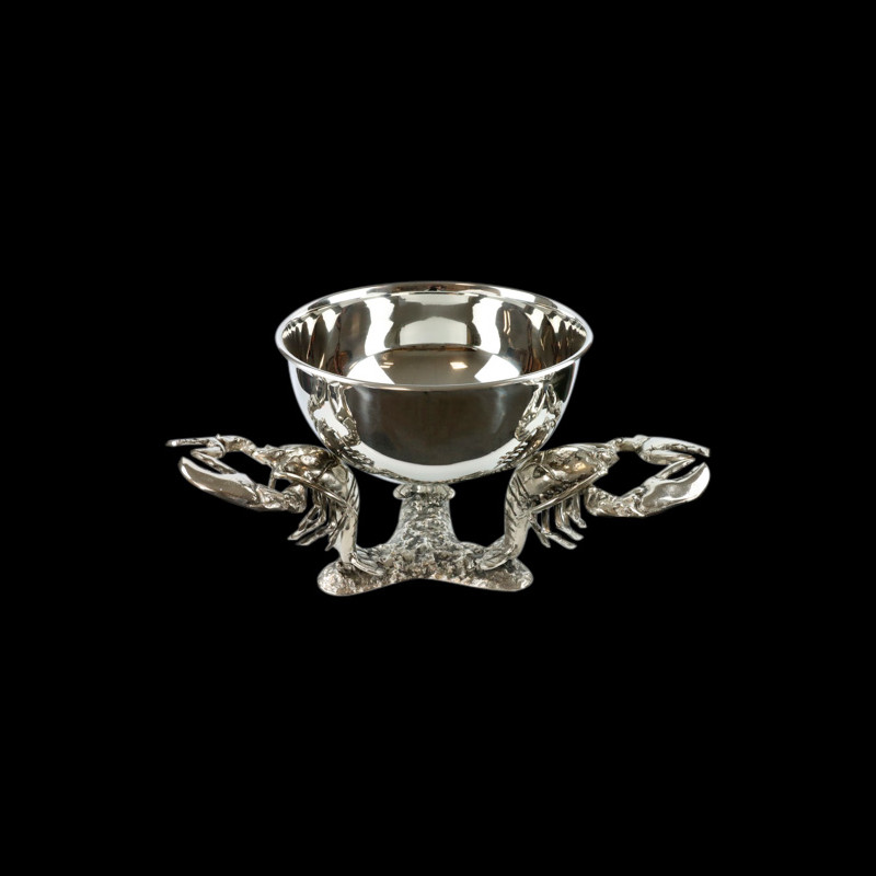 A bowl with lobster-shaped legs and a silver-coloured cast aluminium bowl.
