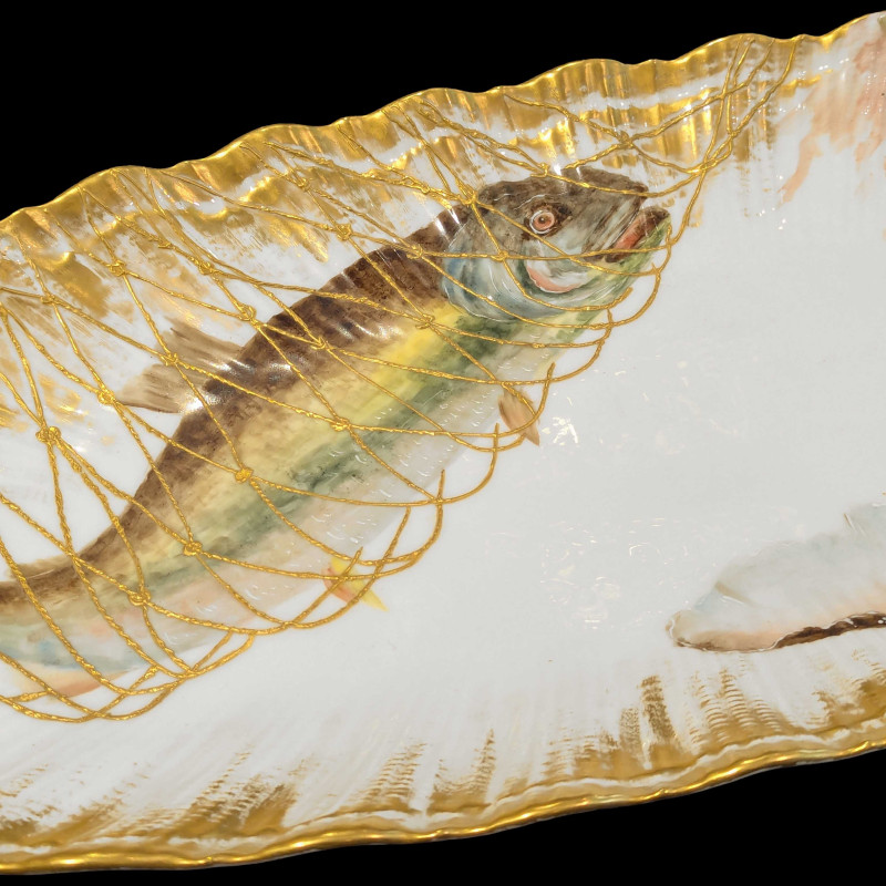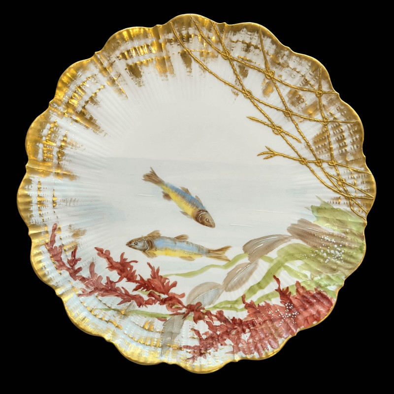 Limoges porcelain fish service with a scalloped border evoking a shell, framing hand-painted aquatic decoration. The whole is enhanced with rich gilding and raised gold forming a delicate fishing net motif. A cohesive and fine quality service, testimony to the technical excellence of the best Limoges productions of the late 19th century.
