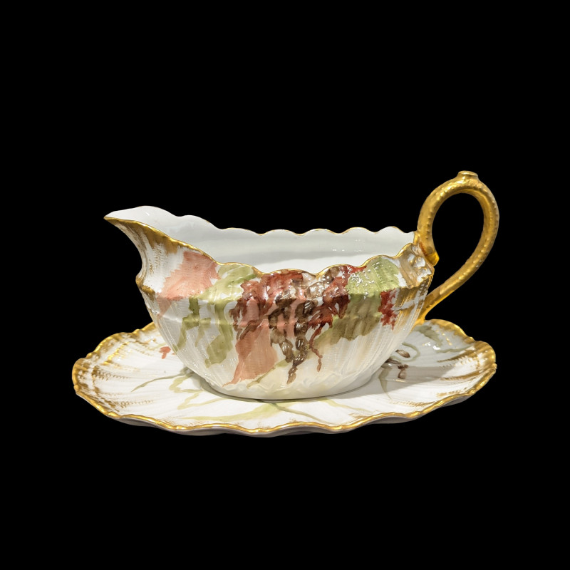 The porcelain pieces were produced by the Redon manufactory, active in Limoges between 1891 and 1906; the decoration was carried out by the Carrié Draper workshop. Each piece features a scalloped and gilded border evoking a shell, echoing the marine theme of the decoration. The aquatic scenes, all different from one another, depict various species of freshwater and sea fish against backgrounds of seaweed, coral and shells in soft watercolour tones of pink, blue, green and ochre. A delicate fishing net motif in raised gilding runs across the surface of each piece, contributing to the overall refinement of the service.