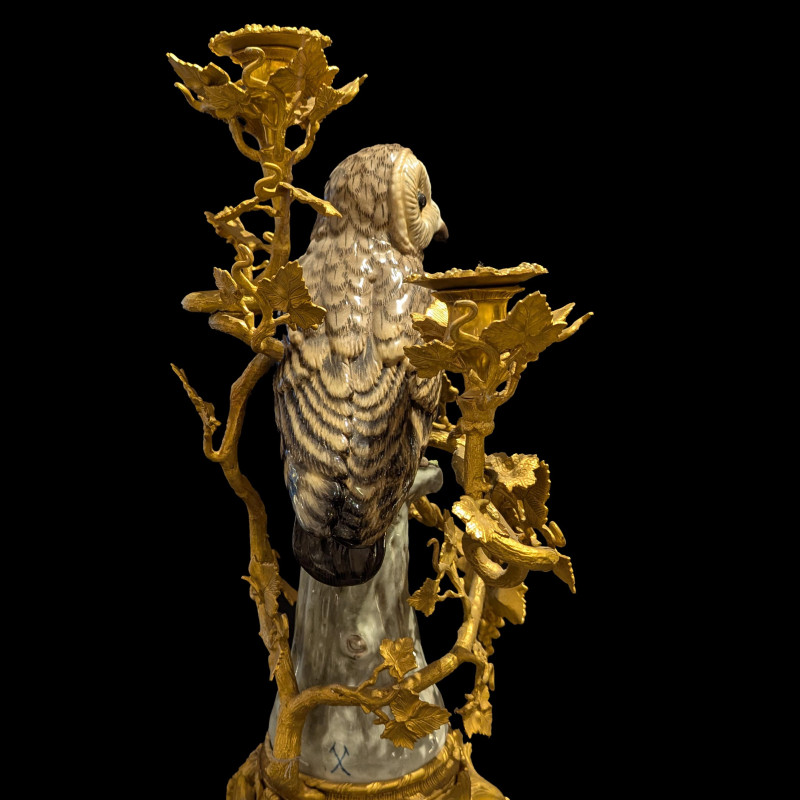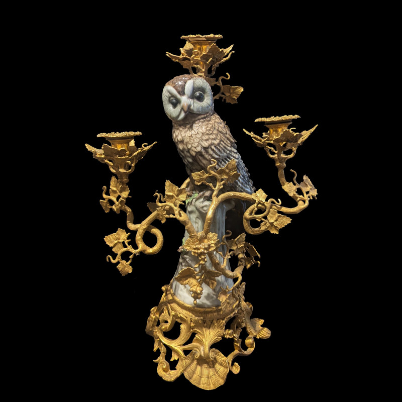 Pair of large three-light candelabras, each featuring a hand-painted porcelain owl perched on a gilt bronze Rococo-style base, entwined with a grapevine stem.