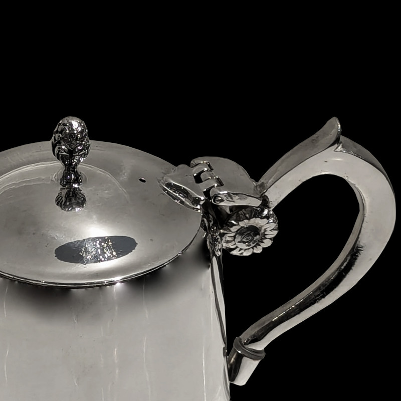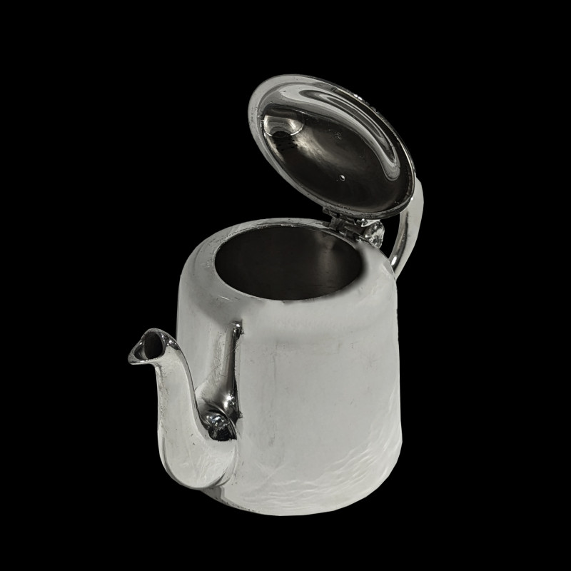 Small silver-plated hotel teapot, late 19th century, 50 cl capacity. Cylindrical body with a smooth surface, flanked by a slender pouring spout and a rounded handle adorned with a small chiselled flower. Lid finial in the shape of a pine cone.