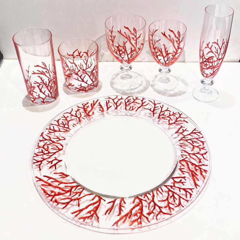 Verre à eau sur pied, en cristal avec un motif de corail rouge.