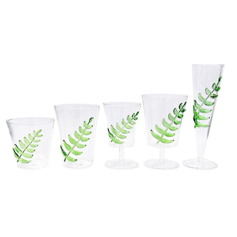 Design délicat et inspiré de la nature. Chaque verre est orné d'une élégante feuille verte en relief, ajoutant une touche végétale et artisanale à votre table. Du verre à eau à la flûte à champagne, chaque pièce allie finesse et originalité, parfaite pour une décoration de table tendance et naturelle.