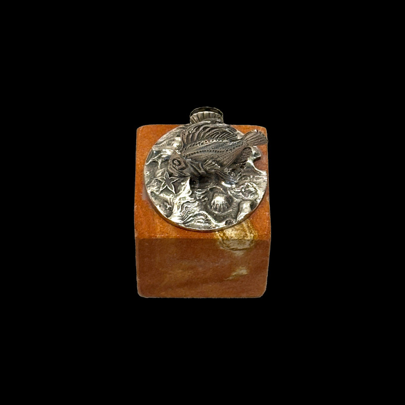 Rare ensemble de six porte-noms de M. Buccellati maitre de l'orfèvrerie italienne. Chaque pièce est finement travaillée en argent sterling et représente une créature marine particulière : un coquillage, un crabe, un hippocampe, un poisson stylisé, un homard et un poisson-lion. Ces scènes miniatures ont été montées sur des socles en pierre dure aux tons chauds.