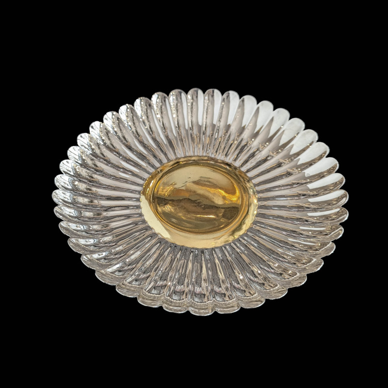 Élégante coupe tripode en forme de fleur ouverte, les pétales en métal argenté rayonnant autour d'un cœur doré. Les trois pieds galbés sont ornés d'un décor végétal stylisé. Une pièce raffinée de la maison Christofle datant de la fin du XIXe-début XXe siècle, idéale pour sublimer une table de réception et présenter quelques confiseries, fruits secs ou mignardises.