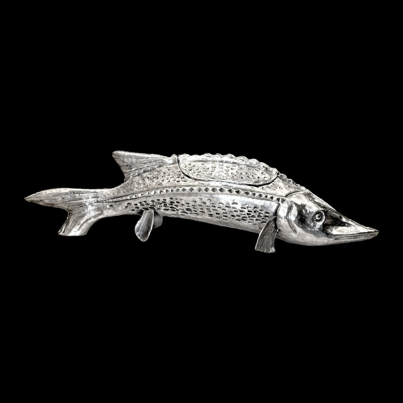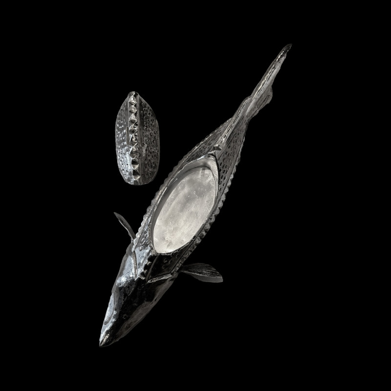 Service à caviar en métal argenté partiellement doré, signé Franco Lapini. Réalisé à Florence vers 1980, il représente un esturgeon au réalisme raffiné, avec couvercle amovible. Pièce iconique de l’art de la table italien, idéale pour les amateurs de design et de luxe.