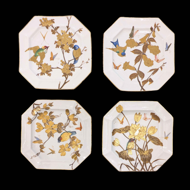 Rare ensemble composé de 15 pièces de forme octogonale constituant un bel exemple de l’Aesthetic Movement, avec ses décors graphiques peints à la main, rehaussés d’or en relief. Ils représentent des oiseaux perchés sur des branches fleuries, exécutés sur une faïence fine anglaise, vers 1880.