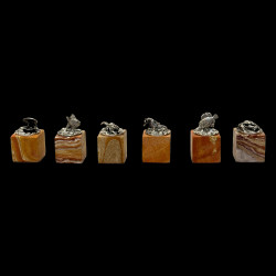 Rare ensemble composé de 15 pièces de forme octogonale constituant un bel exemple de l’Aesthetic Movement, avec ses décors graphiques peints à la main, rehaussés d’or en relief. Ils représentent des oiseaux perchés sur des branches fleuries, exécutés sur une faïence fine anglaise, vers 1880.